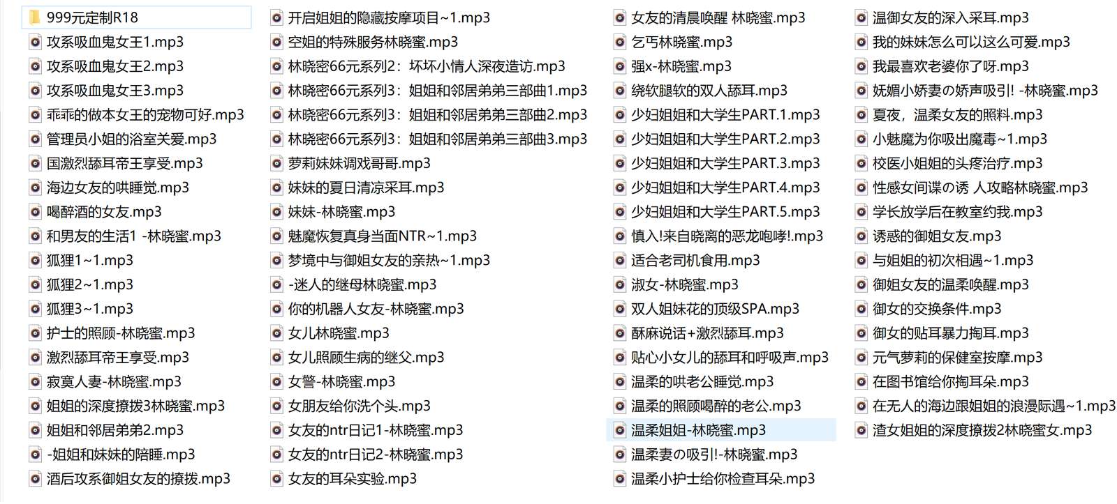 林晓蜜价值千元超社保音声:119部!定制大合集作品介绍:这位【林晓蜜】小姐姐的音声可以说是超高素质ASMR系列了。本次整合了包含R18定制版在内,更新至20年6月的最新最全大合集!总容量4.3G一共119部,光看目录你们就知道这玩意到底有多带劲!好东西不必多说,赶紧下载收藏,~